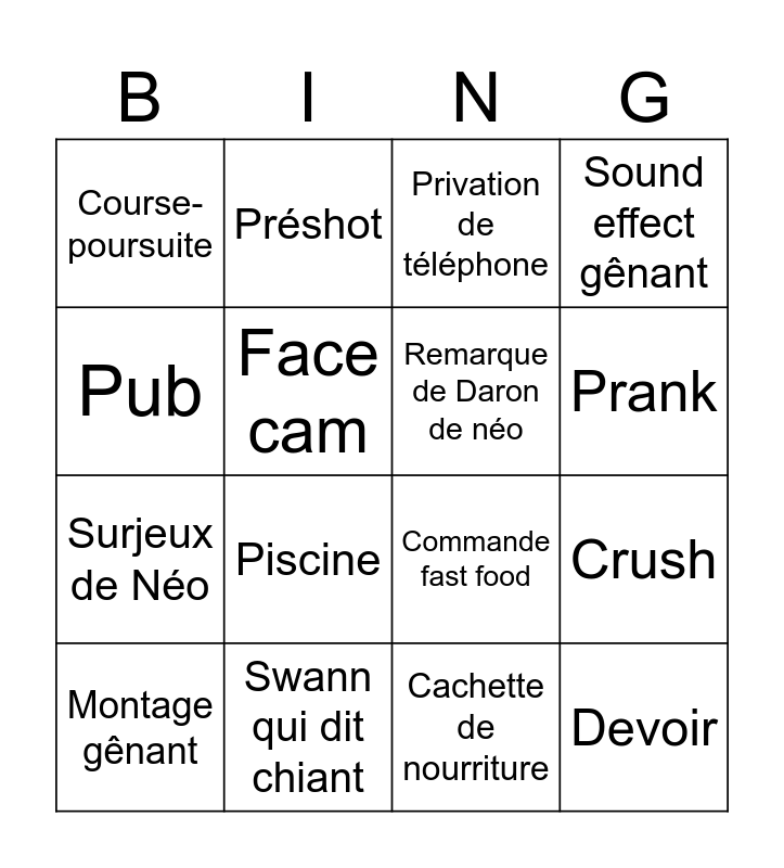 This bingo card has 16 words: Swann qui dit chiant, Crush, Privation de téléphone, Course-poursuite, Surjeux de Néo, Préshot, Commande fast food, Cachette de nourriture, Pub, Face cam, Montage gênant, Sound effect gênant, Piscine, Prank, Remarque de Daron de néo and Devoir.