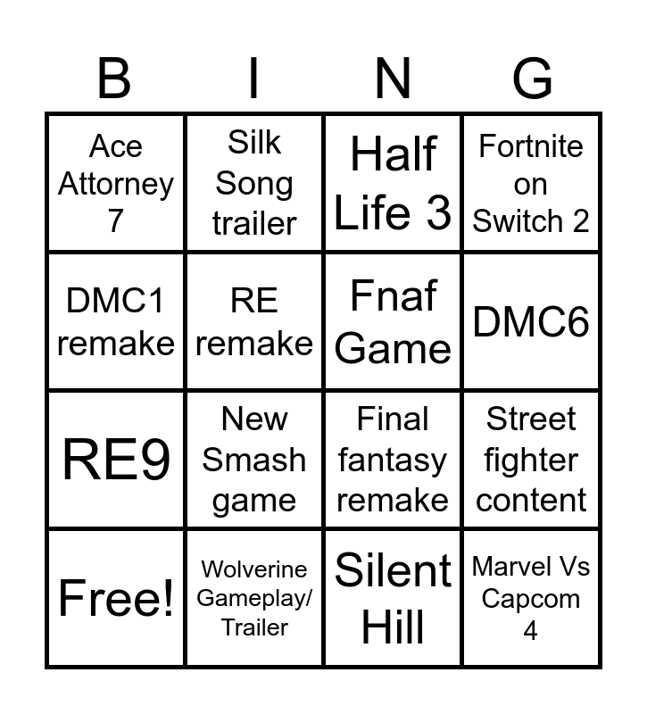 This bingo card has 16 words: Wolverine Gameplay/ Trailer, Street fighter content, Half Life 3, Ace Attorney 7, RE9, Silk Song trailer, Final fantasy remake, Silent Hill, DMC1 remake, RE remake, Free!, Fortnite on Switch 2, New Smash game, DMC6, Fnaf Game and Marvel Vs Capcom 4.