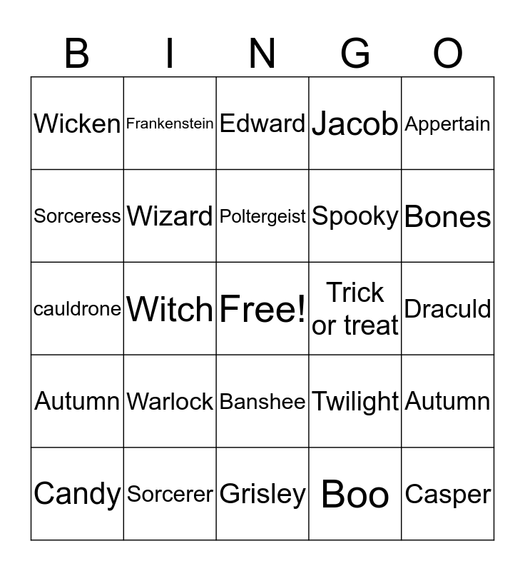 This bingo card has a free space and 24 words: Warlock, Sorcerer, Poltergeist, Candy, Appertain, Wicken, Sorceress, Frankenstein, Trick or treat, Banshee, Spooky, cauldrone, Twilight, Autumn, Wizard, Boo, Draculd, Edward, Bones, Witch, Casper, Autumn, Jacob and Grisley.