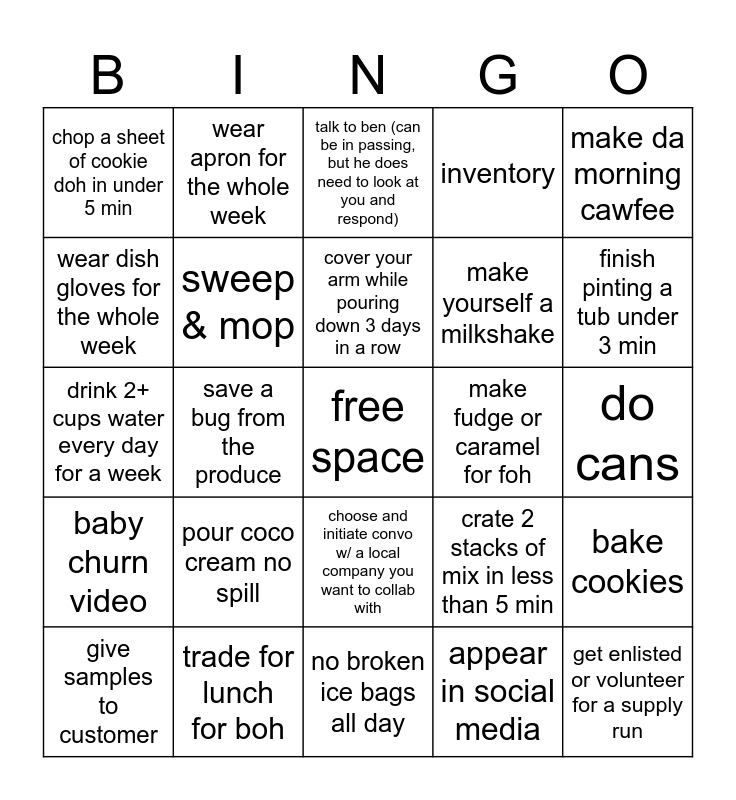 This bingo card has a free space and 24 words: pour coco cream no spill, trade for lunch for boh, cover your arm while pouring down 3 days in a row, give samples to customer, make da morning cawfee, chop a sheet of cookie doh in under 5 min, wear dish gloves for the whole week, wear apron for the whole week, make fudge or caramel for foh, choose and initiate convo w/ a local company you want to collab with, make yourself a milkshake, drink 2+ cups water every day for a week, crate 2 stacks of mix in less than 5 min, bake cookies, sweep & mop, appear in social media, do cans, talk to ben (can be in passing, but he does need to look at you and respond), finish pinting a tub under 3 min, save a bug from the produce, get enlisted or volunteer for a supply run, baby churn video, inventory and no broken ice bags all day.
