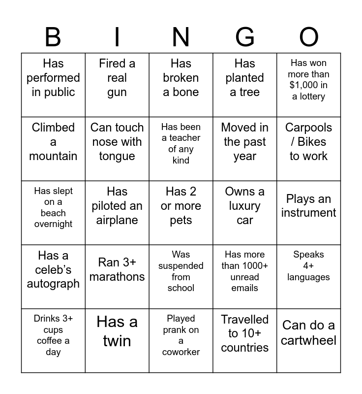 This bingo card has 40 words: Meditates regularly, Has slept on a beach overnight, Can show you a magic trick, Can touch nose with tongue, Has a twin, Was suspended from school, Has been a teacher of any kind, Has been in jail, Has won more than $1,000 in a lottery, Has a celeb’s autograph, Has piloted an airplane, Has planted a tree, Has 2 or more pets, Plays an instrument, Owns a luxury car, Ran 3+ marathons, Received an award, Has performed in public, Currently a student, Has broken a bone, Speaks 4+ languages, Travelled to 10+ countries, Moved in the past year, Climbed a mountain, Owns a vacation house, Proposed to spouse in public, Appeared in a movie, Likes pineapple on pizza, Can do a cartwheel, Sends Christmas cards, Loves karaoke, Drinks 3+ cups coffee a day, Live both on east and west coast, Has more than 1000+ unread emails, Carpools / Bikes to work, Played prank on a coworker, Works out before work, Going on vacation soon, Fired a real gun and Not on social media.