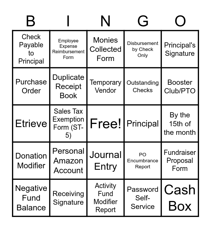 This bingo card has a free space and 28 words: Fundraiser Proposal Form, SmartFusion, Outstanding Checks, Password Self-Service, Purchase Order, Monies Collected Form, Employee Expense Reimbursement Form, Donation Modifier, Principal, Negative Fund Balance, Etrieve, Disbursement by Check Only, Receiving Signature, Activity Fund Modifier Report, Booster Club/PTO, Deposit Variance, Personal Amazon Account, Duplicate Receipt Book, Temporary Vendor, Journal Entry, Check Payable to Principal, General Fund, Cash Box, Sales Tax Exemption Form (ST-5), By the 15th of the month, PO Encumbrance Report, Principal's Signature and Single line strike-through & initals.