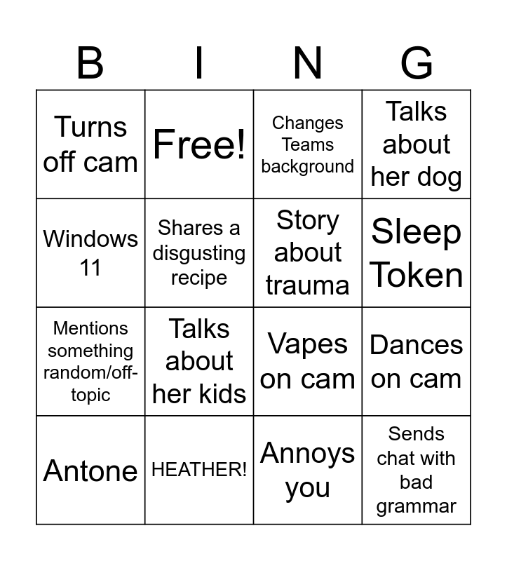 This bingo card has 20 words: Dances on cam, Talks about moving, Changes Teams background, Talks about her $500 chair, Antone, Windows 11, HEATHER!, Turns off cam, Mentions something random/off-topic, Free!, Talks about her kids, Vapes on cam, Shares a disgusting recipe, Sends chat with bad grammar, Story about trauma, Talks about her last job, Sleep Token, Talks about her dog, Annoys you and Looks for recognition.