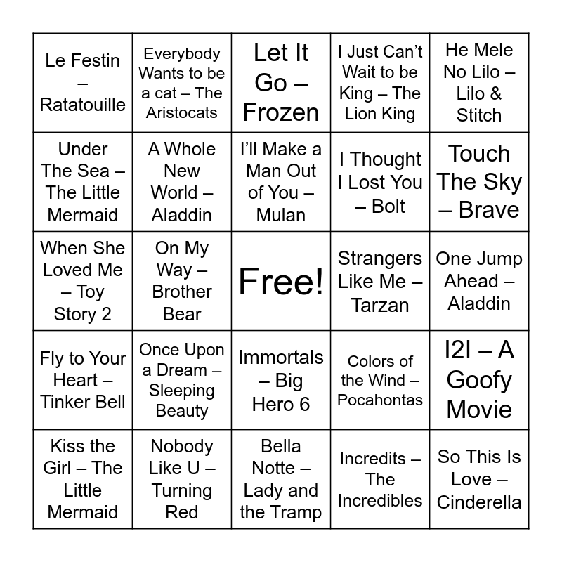 This bingo card has a free space and 50 words: Whistle While You Work – Snow White and the Seven Dwarfs, So This Is Love – Cinderella, Second Star to the Right – Peter Pan, Bella Notte – Lady and the Tramp, Once Upon a Dream – Sleeping Beauty, Cruella – One Hundred and One Dalmatians, Everybody Wants to be a cat – The Aristocats, Why Should I worry? – Oliver & Company, Under The Sea – The Little Mermaid, Be Our Guest – Beauty and the Beast, A Whole New World – Aladdin, I Just Can’t Wait to be King – The Lion King, I2I – A Goofy Movie, Colors of the Wind – Pocahontas, You’ve Got a Friend in Me – Toy Story, Zero To Hero – Hercules, I’ll Make a Man Out of You – Mulan, Strangers Like Me – Tarzan, If I Didn’t Have You – Monsters, Inc., He Mele No Lilo – Lilo & Stitch, On My Way – Brother Bear, Incredits – The Incredibles, Le Festin – Ratatouille, I Thought I Lost You – Bolt, Married Life – Up, I’ve Got a Dream – Tangled, Touch The Sky – Brave, When Can I See You Again? – Wreck-It Ralph, Let It Go – Frozen, Immortals – Big Hero 6, Try Everything – Zootopia, You’re Welcome – Moana, Un Poco Loco – Coco, We Don’t Talk About Bruno – Encanto, Nobody Like U – Turning Red, Steal The Show – Elemental, Almost There – Princess and the Frog, Lost in the Woods – Frozen 2, Part of Your World – The Little Mermaid, One Jump Ahead – Aladdin, Be Prepared – The Lion King, Kids of the Future – Meet the Robinsons, Hakuna Matata – The Lion King, When Will My Life Begin? – Tangled, Kiss the Girl – The Little Mermaid, When She Loved Me – Toy Story 2, How Far I’ll Go – Moana, I Won’t Say (I’m In Love) – Hercules, Fly to Your Heart – Tinker Bell and Hawaiian Roller Coaster Ride – Lilo & Stitch.