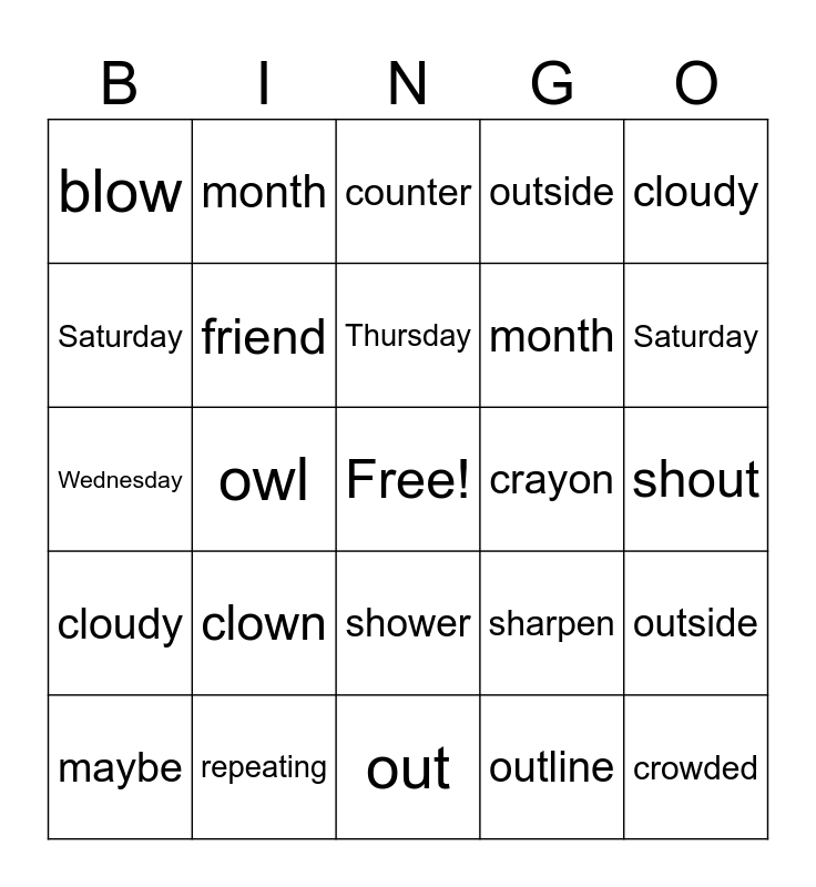 This bingo card has a free space and 45 words: tower, crowded, blow, maybe, shout, outline, counter, sharpen, cloudy, repeating, outside, crayon, shower, clown, owl, out, nothing, Wednesday, Thursday, Saturday, month, tower, crowded, blow, maybe, shout, outline, counter, sharpen, cloudy, repeating, outside, crayon, shower, clown, owl, out, nothing, Wednesday, Thursday, Saturday, month, America, friend and mother.