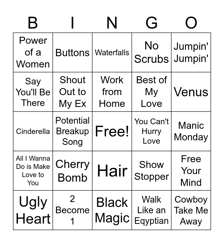 This bingo card has a free space and 27 words: Show Stopper, Bootylicious, Best of My Love, Black Magic, Say You'll Be There, Waterfalls, Buttons, All I Wanna Do is Make Love to You, You Can't Hurry Love, Free Your Mind, Cinderella, No Scrubs, Ugly Heart, 2 Become 1, Venus, Stop! in The Name Of Love, Shout Out to My Ex, Work from Home, Cherry Bomb, Power of a Women, Manic Monday, Walk Like an Eqyptian, Potential Breakup Song, Cowboy Take Me Away, Hair, Jumpin' Jumpin' and Hold On.