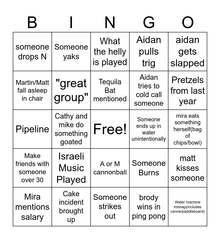 This bingo card has a free space and 24 words: Israeli Music Played, Cake incident brought up, Tequila Bat mentioned, Mira mentions salary, aidan gets slapped, someone drops N, Martin/Matt fall asleep in chair, Someone yaks, Someone ends up in water unintentionally, A or M cannonball, Aidan tries to cold call someone, Pipeline, Someone Burns, matt kisses someone, "great group", brody wins in ping pong, mira eats something herself(bag of chips/bowl), What the helly is played, Pretzels from last year, Cathy and mike do something goated, Water machine mishap(includes canoe/paddleboard), Make friends with someone over 30, Aidan pulls trig and Someone strikes out.