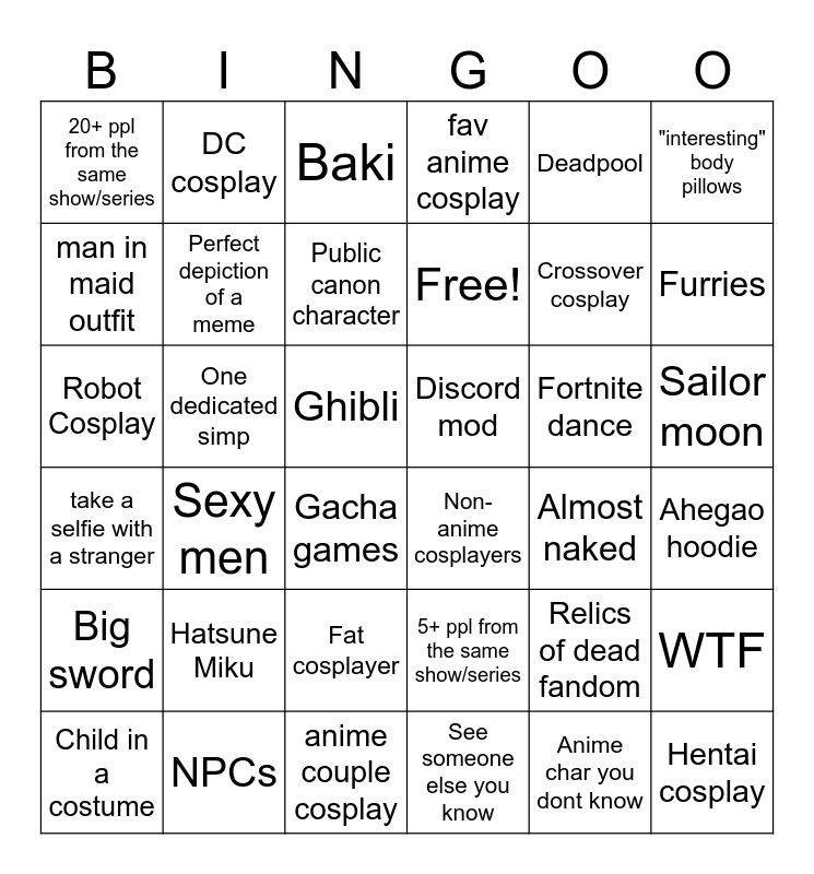 This bingo card has 36 words: 5+ ppl from the same show/series, Fat cosplayer, See someone else you know, man in maid outfit, take a selfie with a stranger, Discord mod, Perfect depiction of a meme, anime couple cosplay, Deadpool, Relics of dead fandom, Furries, fav anime cosplay, WTF, One dedicated simp, Free!, 20+ ppl from the same show/series, Big sword, Fortnite dance, Robot Cosplay, Baki, Ghibli, Sexy men, Non-anime cosplayers, Gacha games, Almost naked, DC cosplay, Crossover cosplay, NPCs, Public canon character, "interesting" body pillows, Hentai cosplay, Child in a costume, Ahegao hoodie, Sailor moon, Hatsune Miku and Anime char you dont know.