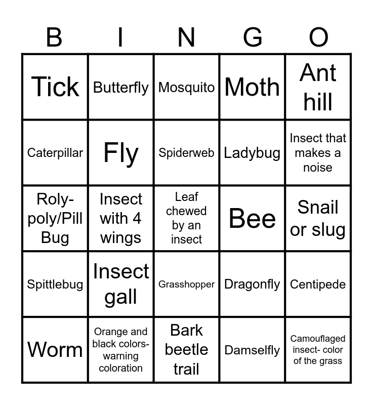 This bingo card has 25 words: Insect gall, Bark beetle trail, Spiderweb, Worm, Ant hill, Tick, Caterpillar, Butterfly, Bee, Grasshopper, Ladybug, Roly-poly/Pill Bug, Dragonfly, Centipede, Fly, Camouflaged insect- color of the grass, Snail or slug, Mosquito, Insect that makes a noise, Insect with 4 wings, Leaf chewed by an insect, Orange and black colors- warning coloration, Spittlebug, Moth and Damselfly.