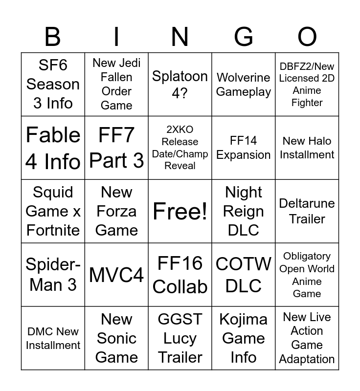 This bingo card has a free space and 24 words: MVC4, New Sonic Game, 2XKO Release Date/Champ Reveal, DMC New Installment, DBFZ2/New Licensed 2D Anime Fighter, SF6 Season 3 Info, Fable 4 Info, New Jedi Fallen Order Game, Night Reign DLC, FF16 Collab, FF14 Expansion, Squid Game x Fortnite, COTW DLC, Obligatory Open World Anime Game, FF7 Part 3, Kojima Game Info, Deltarune Trailer, Splatoon 4?, New Halo Installment, New Forza Game, New Live Action Game Adaptation, Spider-Man 3, Wolverine Gameplay and GGST Lucy Trailer.
