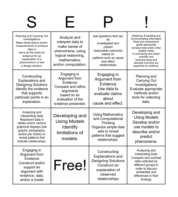 This bingo card has 16 words: Free!, Developing and Using Models Develop and/or use models to describe and/or predict phenomena., Ask questions that can be investigated and predict reasonable outcomes based on patterns such as cause and effect relationships, Planning and Carrying Out Investigations Make observations and/or measurements to produce data to serve as the basis for evidence for an explanation of a phenomenon or test a design solution., Analyzing and Interpreting Data Represent data in tables and/or various graphical displays (bar graphs, pictographs, and/or pie charts) to reveal patterns that indicate relationships., Analyze and interpret data to make sense of phenomena, using logical reasoning, mathematics, and/or computation., Using Mathematics and Computational Thinking Organize simple data sets to reveal patterns that suggest relationships., Constructing Explanations and Designing Solutions Construct an explanation of observed relationships, Constructing Explanations and Designing Solutions Identify the evidence that supports particular points in an explanation., Engaging in Argument from Evidence Compare and refine arguments based on an evaluation of the evidence presented., Engaging in Argument from Evidence Construct and/or support an argument with evidence, data, and/or a model, Obtaining, Evaluating and Communicating Information Read and comprehend grade-appropriate complex texts and/or other reliable media to summarize and obtain scientific and technical ideas and describe how they are supported by evidence., Developing and Using Models Identify limitations of models., Planning and Carrying Out Investigations Evaluate appropriate methods and/or tools for collecting data., Engaging in Argument from Evidence Use data to evaluate claims about cause and effect. and Analyzing and Interpreting Data Compare and contrast data collected by different groups in order to discuss similarities and differences in their findings.