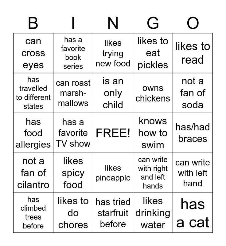 This bingo card has a free space and 59 words: has a dog, likes to do chores, has an older sibling, not a fan of cilantro, likes drinking water, can write in cursive, can roast marsh-mallows, is a good artist, owns chickens, has a surprising talent, likes to eat pickles, can speak another language, has travelled to different states, not a fan of candy, has lived outside the USA, can cross eyes, has a cat, likes to read, has been to a concert, is an only child, knows how to swim, likes trying new food, has climbed trees before, can write with left hand, wears glasses, has long hair, has curly/wavy hair, is wearing yellow, not a fan of soda, is on a sports or academic team, has always been at this school, has not always been at this school, likes organizing things, relative works in a hospital, has a favorite book series, relative works on cars, relative is a teacher, has a favorite TV show, has a favorite YouTube channel, has food allergies, is a twin, likes spicy food, has/had braces, knows musicals, is afraid of heights, is allergic to pets, has met someone famous, can sing old church hymns, likes pineapple, has tried starfruit before, likes going on walks, favorite season is spring, favorite season is summer, favorite season is autumn, favorite season is winter, can write with right and left hands, likes eating veggies, has been to the state fair and has never travelled outside the state.
