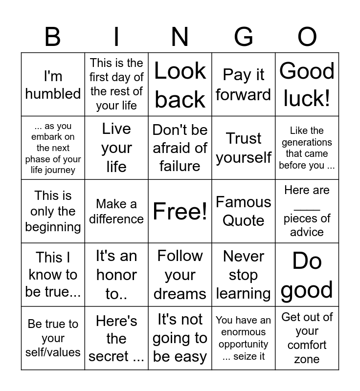 This bingo card has a free space and 24 words: It's an honor to.., Here's the secret ..., Don't be afraid of failure, Be true to your self/values, Good luck!, I'm humbled, ... as you embark on the next phase of your life journey, This is the first day of the rest of your life, Famous Quote, Follow your dreams, Trust yourself, This is only the beginning, Never stop learning, Do good, Live your life, You have an enormous opportunity ... seize it, Here are ____ pieces of advice, Look back, Like the generations that came before you ..., Make a difference, Get out of your comfort zone, This I know to be true..., Pay it forward and It's not going to be easy.
