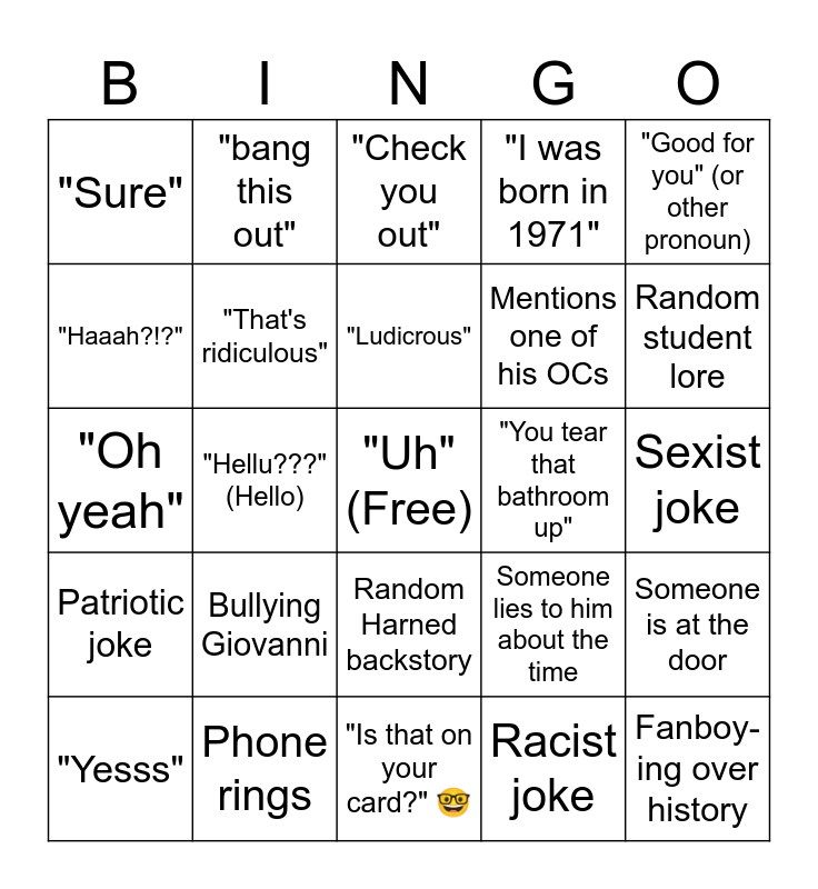 This bingo card has a free space and 35 words: "Uhhh Uhhh Uhhh", "what are you guys TALKING about???", Gay comment, "That's ridiculous", Random Harned backstory, "I was born in 1971", "Haaah?!?", "Aaalright , so-", "Ludicrous", out of pocket comment, "Oh yeah", "Good for you" (or other pronoun), Mocking voice, Exasperated sigh, "Sure", "You tear that bathroom up", Racist joke, "Hellu???" (Hello), Patriotic joke, Fanboy-ing over history, Someone lies to him about the time, "Yesss", Someone is at the door, Phone rings, "Check you out", Random student lore, Mocking a student, Makes a dark joke, Mentions one of his OCs, Sexist joke, "Anyway, uh-", "Is that on your card?" 🤓, Bullying Giovanni, "bang this out" and Come on yo.