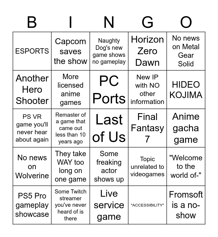 This bingo card has a free space and 24 words: They take WAY too long on one game, Some Twitch streamer you've never heard of is there, PC Ports, PS5 Pro gameplay showcase, No news on Metal Gear Solid, ESPORTS, Another Hero Shooter, Capcom saves the show, Final Fantasy 7, Some freaking actor shows up, New IP with NO other information, PS VR game you'll never hear about again, Topic unrelated to videogames, "Welcome to the world of-", More licensed anime games, "ACCESSIBILITY", Anime gacha game, Naughty Dog's new game shows no gameplay, HIDEO KOJIMA, Remaster of a game that came out less than 10 years ago, Fromsoft is a no-show, No news on Wolverine, Horizon Zero Dawn and Live service game.