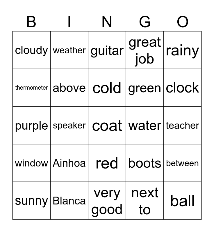 This bingo card has a free space and 24 words: Ainhoa, Blanca, cold, sunny, rainy, cloudy, thermometer, weather, water, red, green, purple, boots, between, above, next to, teacher, guitar, clock, speaker, ball, window, great job and very good.