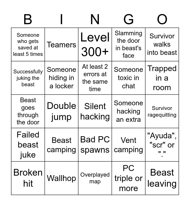 This bingo card has 25 words: Beast camping, Overplayed map, At least 2 errors at the same time, Broken hit, Survivor walks into beast, Someone who gets saved at least 5 times, Successfully juking the beast, Teamers, Someone hacking an extra, Bad PC spawns, Someone toxic in chat, Beast goes through the door, Vent camping, "Ayuda", "scr" or ".", Someone hiding in a locker, Beast leaving, Survivor ragequitting, Level 300+, Trapped in a room, Double jump, Silent hacking, Wallhop, Failed beast juke, Slamming the door in beast's face and PC triple or more.