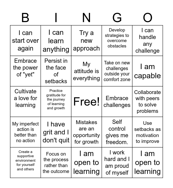 This bingo card has a free space and 24 words: I have grit and I don't quit, Focus on the process rather than the outcome, My attitude is everything, Create a supportive environment for yourself and others, I can handle any challenge, I can start over again, Embrace the power of "yet", I can learn anything, Embrace challenges, Mistakes are an opportunity for growth, Take on new challenges outside your comfort zone, Cultivate a love for learning, Self control gives me freedom., Use setbacks as motivation to improve, Persist in the face of setbacks, I work hard and I am proud of myself, Collaborate with peers to solve problems, Try a new approach, I am capable, Practice gratitude for the journey of learning and growth, I am open to learning, My imperfect action is better than no action, Develop strategies to overcome obstacles and I am open to learning.