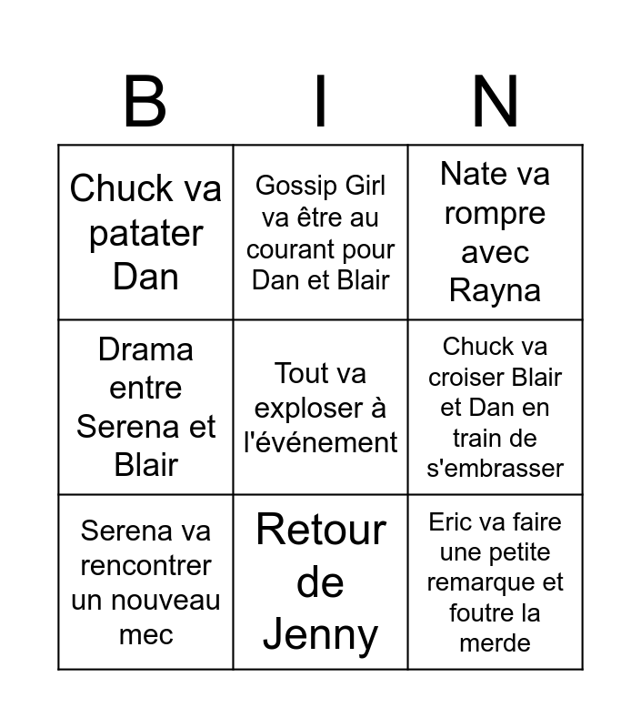 This bingo card has a free space and 8 words: Chuck va croiser Blair et Dan en train de s'embrasser, Nate va rompre avec Rayna, Gossip Girl va être au courant pour Dan et Blair, Serena va rencontrer un nouveau mec, Chuck va patater Dan, Eric va faire une petite remarque et foutre la merde, Drama entre Serena et Blair and Retour de Jenny.