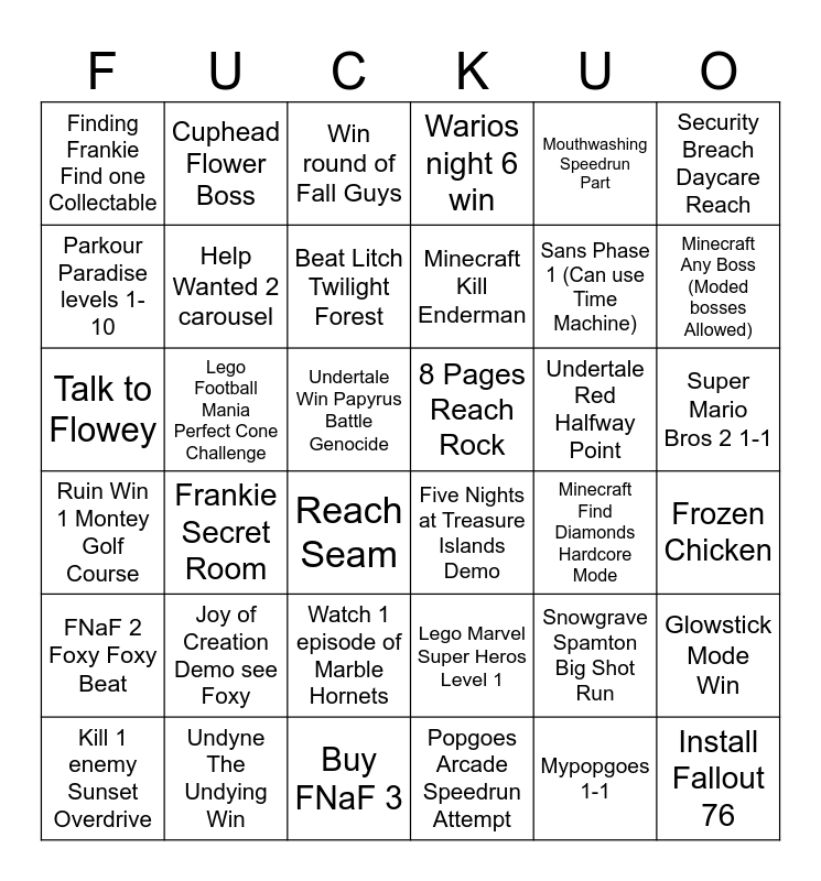 This bingo card has 36 words: Lego Marvel Super Heros Level 1, Watch 1 episode of Marble Hornets, Popgoes Arcade Speedrun Attempt, Parkour Paradise levels 1-10, Ruin Win 1 Montey Golf Course, 8 Pages Reach Rock, Help Wanted 2 carousel, Buy FNaF 3, Mouthwashing Speedrun Part, Snowgrave Spamton Big Shot Run, Minecraft Any Boss (Moded bosses Allowed), Warios night 6 win, Glowstick Mode Win, Lego Football Mania Perfect Cone Challenge, Minecraft Kill Enderman, Finding Frankie Find one Collectable, FNaF 2 Foxy Foxy Beat, Undertale Red Halfway Point, Talk to Flowey, Win round of Fall Guys, Undertale Win Papyrus Battle Genocide, Frankie Secret Room, Five Nights at Treasure Islands Demo, Reach Seam, Minecraft Find Diamonds Hardcore Mode, Cuphead Flower Boss, Sans Phase 1 (Can use Time Machine), Undyne The Undying Win, Beat Litch Twilight Forest, Security Breach Daycare Reach, Install Fallout 76, Kill 1 enemy Sunset Overdrive, Frozen Chicken, Super Mario Bros 2 1-1, Joy of Creation Demo see Foxy and Mypopgoes 1-1.