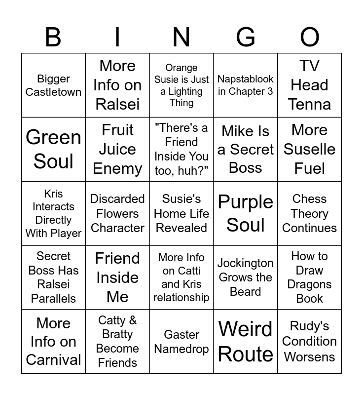 This bingo card has 25 words: Friend Inside Me, Gaster Namedrop, "There's a Friend Inside You too, huh?", More Info on Carnival, TV Head Tenna, Bigger Castletown, Green Soul, More Info on Ralsei, Purple Soul, More Info on Catti and Kris relationship, Mike Is a Secret Boss, Kris Interacts Directly With Player, Jockington Grows the Beard, How to Draw Dragons Book, Fruit Juice Enemy, Rudy's Condition Worsens, Chess Theory Continues, Orange Susie is Just a Lighting Thing, More Suselle Fuel, Discarded Flowers Character, Susie's Home Life Revealed, Catty & Bratty Become Friends, Secret Boss Has Ralsei Parallels, Napstablook in Chapter 3 and Weird Route.