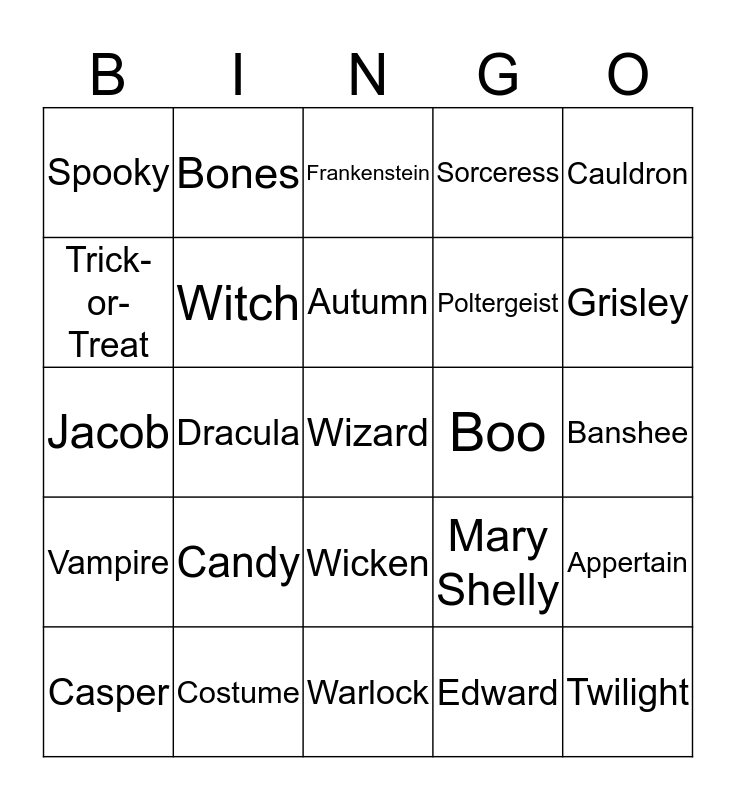 This bingo card has a free space and 24 words: Candy, Costume, Autumn, Casper, Cauldron, Spooky, Trick-or-Treat, Bones, Boo, Wicken, Poltergeist, Jacob, Mary Shelly, Appertain, Witch, Edward, Banshee, Frankenstein, Grisley, Dracula, Twilight, Vampire, Sorceress and Warlock.