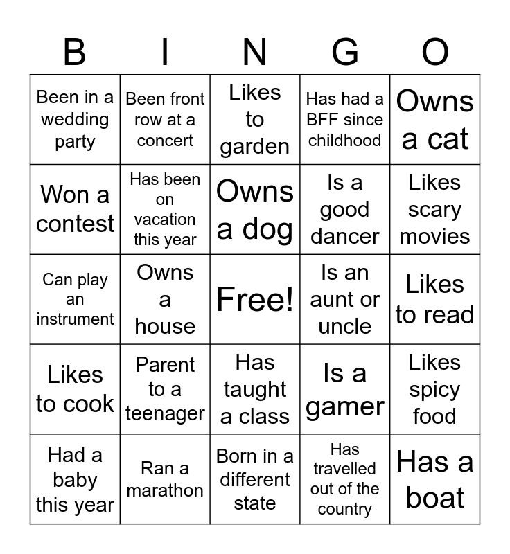 This bingo card has a free space and 24 words: Parent to a teenager, Ran a marathon, Owns a dog, Had a baby this year, Owns a cat, Been in a wedding party, Won a contest, Been front row at a concert, Is an aunt or uncle, Has taught a class, Is a good dancer, Can play an instrument, Is a gamer, Likes spicy food, Has been on vacation this year, Has travelled out of the country, Likes to read, Likes to garden, Likes scary movies, Owns a house, Has a boat, Likes to cook, Has had a BFF since childhood and Born in a different state.
