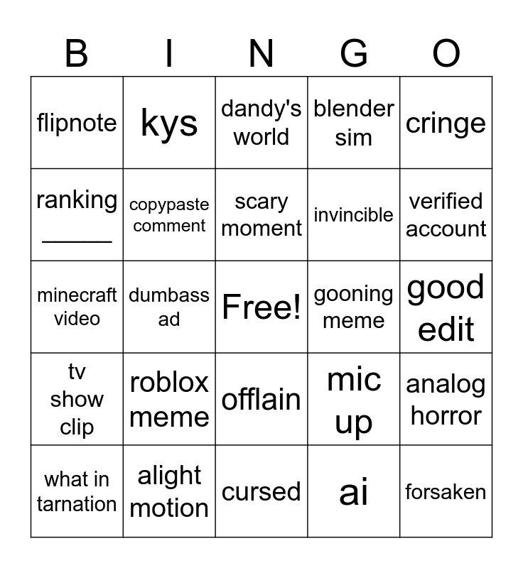 This bingo card has a free space and 24 words: roblox meme, alight motion, scary moment, what in tarnation, cringe, flipnote, ranking _____, kys, gooning meme, offlain, invincible, minecraft video, mic up, analog horror, copypaste comment, ai, good edit, dandy's world, verified account, dumbass ad, forsaken, tv show clip, blender sim and cursed.