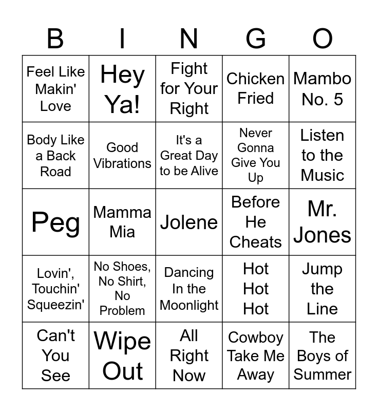 This bingo card has 31 words: All Right Now, Ants Marching, Mamma Mia, It's 5 O'Clock Somewhere, Feel Like Makin' Love, Fight for Your Right, Good Vibrations, Hot Hot Hot, Before He Cheats, Cowboy Take Me Away, Mr. Jones, Jolene, The Boys of Summer, Hot Stuff, Listen to the Music, Cruise, Jump the Line, No Shoes, No Shirt, No Problem, Lovin', Touchin' Squeezin', Dancing In the Moonlight, Mambo No. 5, Country Girl (Shake It For Me), Can't You See, Hey Ya!, Never Gonna Give You Up, Body Like a Back Road, Chicken Fried, Peg, Wipe Out, It's a Great Day to be Alive and Island in the Sun.