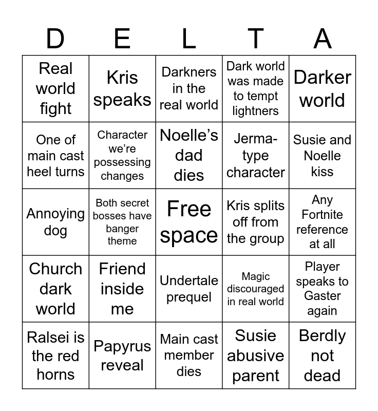 This bingo card has a free space and 24 words: Friend inside me, Papyrus reveal, Noelle’s dad dies, Ralsei is the red horns, Darker world, Real world fight, One of main cast heel turns, Kris speaks, Kris splits off from the group, Undertale prequel, Jerma-type character, Annoying dog, Magic discouraged in real world, Player speaks to Gaster again, Character we’re possessing changes, Susie abusive parent, Any Fortnite reference at all, Darkners in the real world, Susie and Noelle kiss, Both secret bosses have banger theme, Berdly not dead, Church dark world, Dark world was made to tempt lightners and Main cast member dies.