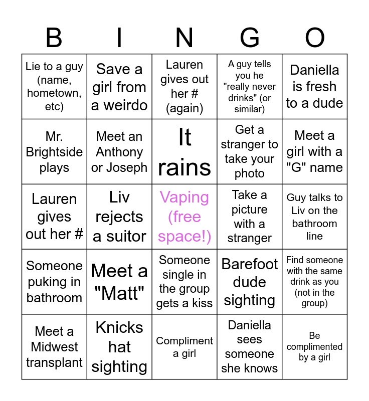 This bingo card has a free space and 24 words: Meet a "Matt", Knicks hat sighting, It rains, Meet a Midwest transplant, Daniella is fresh to a dude, Lie to a guy (name, hometown, etc), Mr. Brightside plays, Save a girl from a weirdo, Take a picture with a stranger, Someone single in the group gets a kiss, Get a stranger to take your photo, Lauren gives out her #, Barefoot dude sighting, Find someone with the same drink as you (not in the group), Meet an Anthony or Joseph, Daniella sees someone she knows, Guy talks to Liv on the bathroom line, Lauren gives out her # (again), Meet a girl with a "G" name, Liv rejects a suitor, Be complimented by a girl, Someone puking in bathroom, A guy tells you he "really never drinks" (or similar) and Compliment a girl.