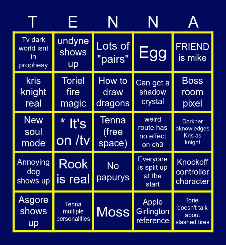 This bingo card has a free space and 24 words: Rook is real, Tenna multiple personalities, How to draw dragons, Asgore shows up, FRIEND is mike, Tv dark world isnt in prophesy, kris knight real, undyne shows up, weird route has no effect on ch3, No papurys, Can get a shadow crystal, New soul mode, Everyone is split up at the start, Knockoff controller character, Toriel fire magic, Apple Girlington reference, Darkner aknowledges Kris as knight, Lots of "pairs", Boss room pixel, * It's on /tv, Toriel doesn't talk about slashed tires, Annoying dog shows up, Egg and Moss.