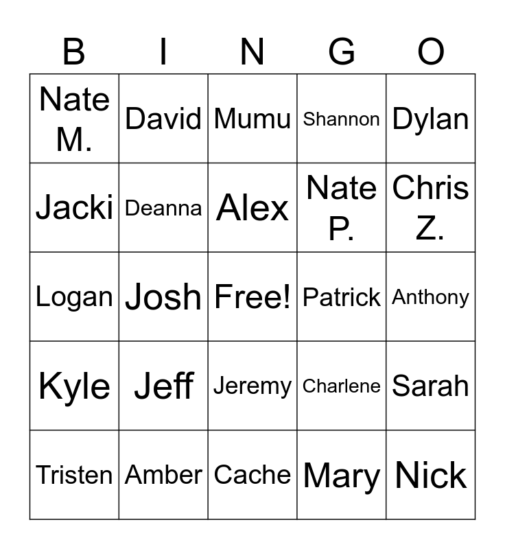 This bingo card has a free space and 41 words: George, Logan, Brian, Deanna, Amber, Jeremy, Alex, Nate F., Dylan, Kyle, Josh, Shannon, Nick, Anthony, Patrick, Jeff, John, Nate M., Julia, Mumu, Sarah, Andrew, Cache, Nate P., Evan, Chris R., Mary, Tyler, Chris Z., Howard, Eric, David, Tristen, Julie, Charlene, Jacki, Nancy, Ramon, LaCresha, Austin and Maria.