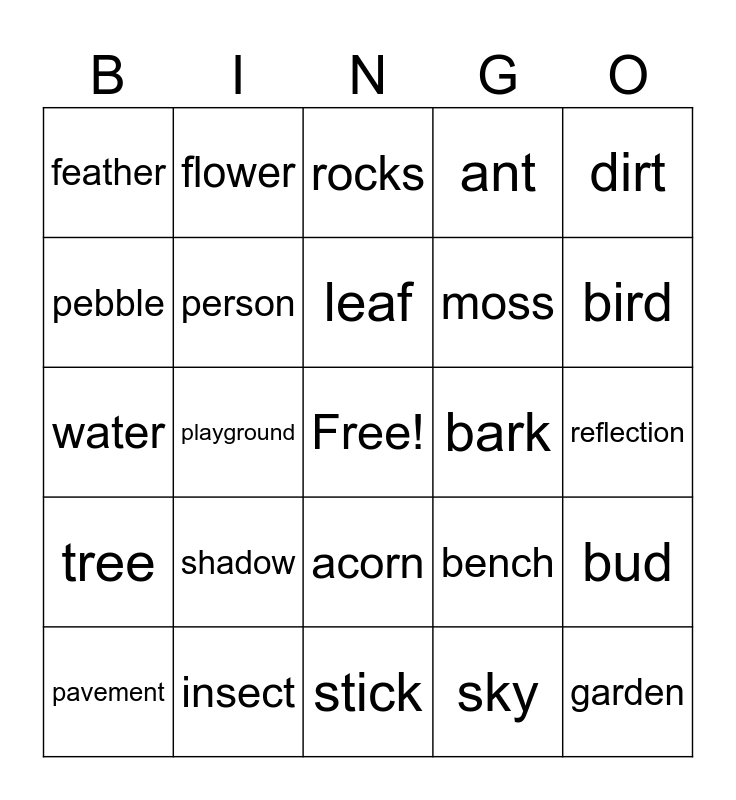 This bingo card has a free space and 34 words: cloud, sky, water, grass, tree, person, dirt, pavement, flower, weed, leaf, rocks, sun, airplane, bark, bird, insect, water, shadow, bench, acorn, pinecone, feather, reflection, stick, garden, ant, horizon, moss, pebble, silhouette, playground, bud and trail.