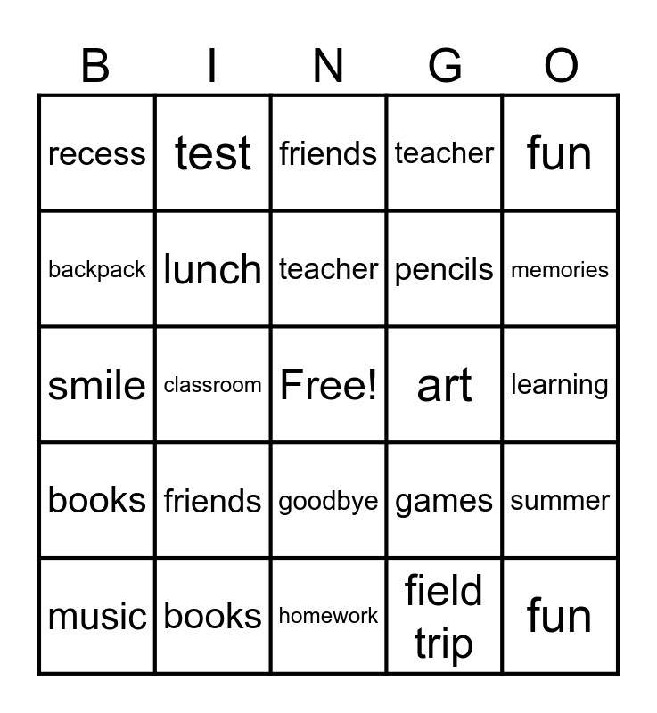 This bingo card has a free space and 24 words: friends, books, teacher, music, fun, recess, backpack, test, art, goodbye, pencils, smile, games, summer, lunch, field trip, learning, friends, memories, classroom, fun, books, teacher and homework.