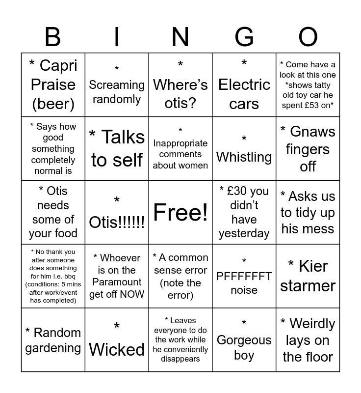 This bingo card has a free space and 30 words: * Wicked, * Darling boy, * Otis!!!!!!, * Pukka, * Capri Praise (beer), * Where’s otis?, * Talks to self, * A common sense error (note the error), * £30 you didn’t have yesterday, * Leaves everyone to do the work while he conveniently disappears, * Asks us to tidy up his mess, * Weirdly lays on the floor, * Gorgeous boy, * hey ho that’s life innit, * Gnaws fingers off, * *speaks into remote* GB News, * PFFFFFFT noise, * No thank you after someone does something for him I.e. bbq (conditions: 5 mins after work/event has completed), * Whoever is on the Paramount get off NOW, * Come have a look at this one *shows tatty old toy car he spent £53 on*, * Otis needs some of your food, * It’s not rocket science, * Screaming randomly, * Whistling, * Says how good something completely normal is, * Electric cars, * Kier starmer, * Random gardening, * Inappropriate comments about women and * Spoke to your mum?.
