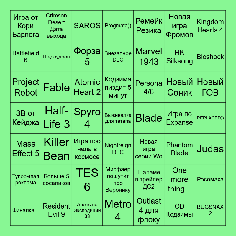 This bingo card has a free space and 48 words: Шаламе в трейлер ДС2, HK Silksong, Metro 4, Half-Life 3, Atomic Heart 2, REPLACED)), Crimson Desert Дата выхода, Resident Evil 9, Новая игра Фромов, Nightreign DLC, Kingdom Hearts 4, Progmata)), Новый Соник, Persona 4/6, Тупорылая реклама, Игра по Expanse, Battlefield 6, Bioshock, One more thing..., Ремейк Резика, Marvel 1943, Spyro 4, Игра от Кори Барлога, Шедоудроп, Росомаха, Форза 5, Новый ГОВ, Финалка..., Кодзима пиздит 5 минут, Fable, OD Кодзимы, Blade, Judas, Больше 5 сосаликов, ЗВ от Кейджа, Новая игра серии Wo, Phantom Blade, Project Robot, Игра про чела в космосе, TES 6, Mass Effect 5, BUGSNAX 2, SAROS, Анонс по Экспедиции 33, Внезапное DLC, Мисфаер пошутит про Веронику, Killer Bean and Outlast 4 для флоку.