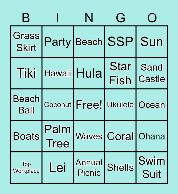 This bingo card has a free space and 29 words: Top Workplace, Sun Glasses, Coconut, Flip Flops, Grass Skirt, Beach, Hawaii, Palm Tree, Ukulele, Lei, Ocean, Swim Suit, Annual Picnic, Shells, Sand Castle, Surf Board, Waves, Boats, Sun, Beach Ball, Coral, Pool, Star Fish, Tiki, SSP, Party, Ohana, Hula and Aloha.