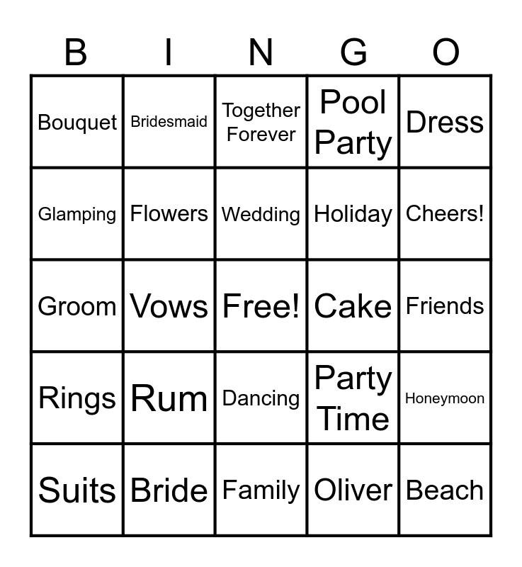 This bingo card has a free space and 34 words: Tash, Oliver, Scott, Cornwall, Rings, Flowers, Dress, Suits, Bridesmaid, June 2025, Wedding, Together Forever, Music, Love, Cake, Cheers!, Bride, Groom, Rum, Party Time, Dancing, Ceremony, Bouquet, Friends, Family, Beach, Pool Party, Speeches, Holiday, Glamping, Marriage, Vows, Honeymoon and Best Man.