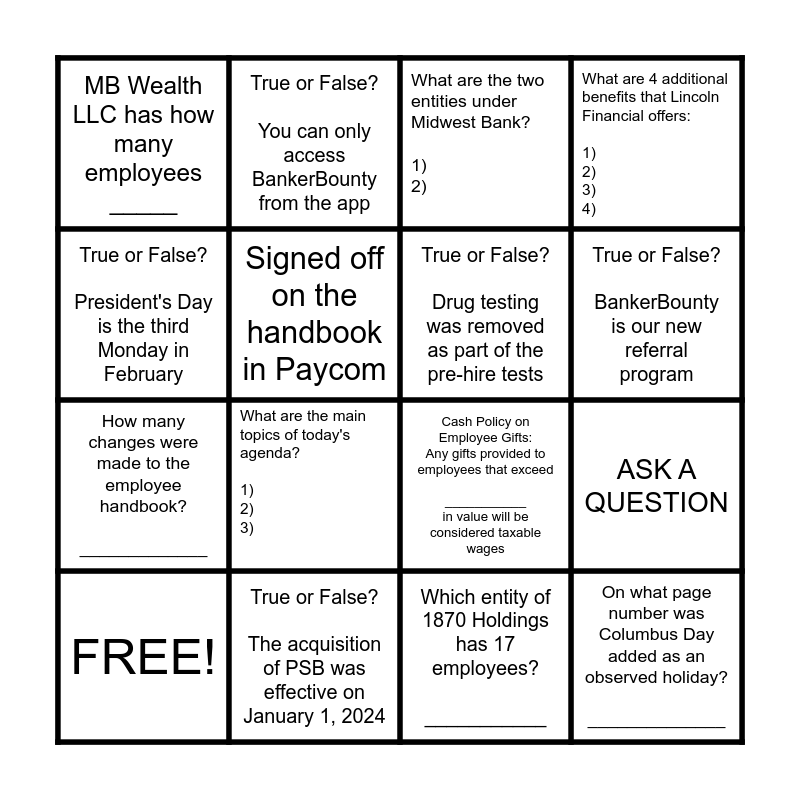 This bingo card has 16 words: FREE!, True or False? The acquisition of PSB was effective on January 1, 2024, What are the two entities under Midwest Bank? 1) 2), What are 4 additional benefits that Lincoln Financial offers: 1) 2) 3) 4), True or False? President's Day is the third Monday in February, True or False? You can only access BankerBounty from the app, Cash Policy on Employee Gifts: Any gifts provided to employees that exceed ___________ in value will be considered taxable wages, ASK A QUESTION, MB Wealth LLC has how many employees _____, Signed off on the handbook in Paycom, Which entity of 1870 Holdings has 17 employees? ___________, True or False? BankerBounty is our new referral program, How many changes were made to the employee handbook? _____________, What are the main topics of today's agenda? 1) 2) 3), True or False? Drug testing was removed as part of the pre-hire tests and On what page number was Columbus Day added as an observed holiday? ______________.