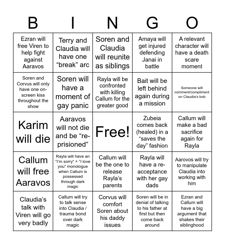 This bingo card has a free space and 24 words: Rayla will have an “I’m sorry” + “I love you” monologue when Callum is possessed through dark magic, Callum will try to talk sense into Claudia / trauma bond over dark magic, Rayla will be confronted with killing Callum for the greater good, Claudia’s talk with Viren will go very badly, A relevant character will have a death scare moment, Ezran will free Viren to help fight against Aaravos, Soren and Corvus will only have one on-screen kiss throughout the show, Terry and Claudia will have one “break” arc, Zubeia comes back (healed) in a “saves the day” fashion, Callum will be the one to release Rayla’s parents, Bait will be left behind again during a mission, Karim will die, Rayla will have a re-acceptance with her gay dads, Aarovos will try to manipulate Claudia into working with him, Soren will have a moment of gay panic, Soren will be in denial of talking to his father at first but then come back around, Callum will make a bad sacrifice again for Rayla, Soren and Claudia will reunite as siblings, Someone will comment/compliment on Claudia’s bob, Aaravos will not die and be “re-prisioned”, Ezran and Callum will have a big argument that shakes their siblinghood, Callum will free Aaravos, Amaya will get injured defending Janai in battle and Corvus will comfort Soren about his daddy issues.