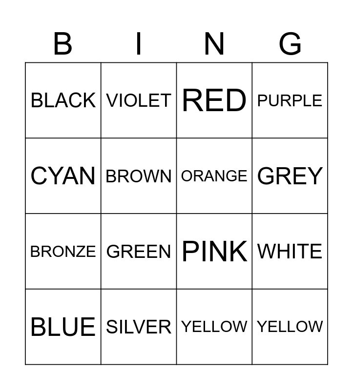 This bingo card has 17 words: YELLOW, BLUE, RED, BLACK, GREEN, PURPLE, WHITE, ORANGE, GREY, BROWN, SILVER, PINK, CYAN, VIOLET, BRONZE, GOLD and YELLOW.
