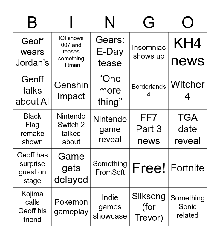 This bingo card has 25 words: Game gets delayed, Indie games showcase, “One more thing”, Kojima calls Geoff his friend, KH4 news, Geoff wears Jordan’s, Geoff talks about AI, IOI shows 007 and teases something Hitman, FF7 Part 3 news, Something FromSoft, Borderlands 4, Black Flag remake shown, Free!, Fortnite, Genshin Impact, Something Sonic related, TGA date reveal, Gears: E-Day tease, Witcher 4, Nintendo Switch 2 talked about, Nintendo game reveal, Pokemon gameplay, Geoff has surprise guest on stage, Insomniac shows up and Silksong (for Trevor).