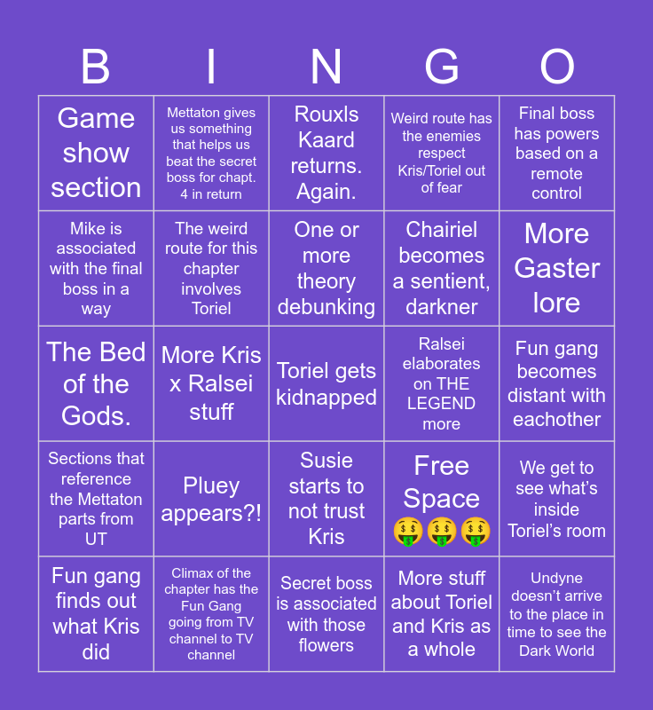 This bingo card has 25 words: Pluey appears?!, Secret boss is associated with those flowers, One or more theory debunking, Fun gang finds out what Kris did, Final boss has powers based on a remote control, Game show section, Mike is associated with the final boss in a way, Mettaton gives us something that helps us beat the secret boss for chapt. 4 in return, Ralsei elaborates on THE LEGEND more, Susie starts to not trust Kris, Chairiel becomes a sentient, darkner, The Bed of the Gods., Free Space 🤑🤑🤑, We get to see what’s inside Toriel’s room, The weird route for this chapter involves Toriel, Undyne doesn’t arrive to the place in time to see the Dark World, Fun gang becomes distant with eachother, Rouxls Kaard returns. Again., More Gaster lore, More Kris x Ralsei stuff, Toriel gets kidnapped, Climax of the chapter has the Fun Gang going from TV channel to TV channel, Sections that reference the Mettaton parts from UT, Weird route has the enemies respect Kris/Toriel out of fear and More stuff about Toriel and Kris as a whole.