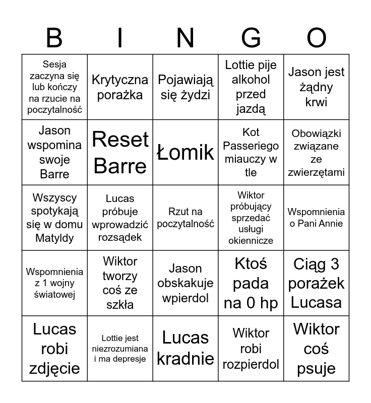 This bingo card has a free space and 24 words: Wiktor tworzy coś ze szkła, Lottie jest niezrozumiana i ma depresje, Łomik, Lucas robi zdjęcie, Jason jest żądny krwi, Sesja zaczyna się lub kończy na rzucie na poczytalność, Jason wspomina swoje Barre, Krytyczna porażka, Wiktor próbujący sprzedać usługi okiennicze, Jason obskakuje wpierdol, Kot Passeriego miauczy w tle, Wszyscy spotykają się w domu Matyldy, Ktoś pada na 0 hp, Ciąg 3 porażek Lucasa, Reset Barre, Wiktor robi rozpierdol, Wspomnienia o Pani Annie, Pojawiają się żydzi, Obowiązki związane ze zwierzętami, Lucas próbuje wprowadzić rozsądek, Wiktor coś psuje, Wspomnienia z 1 wojny światowej, Lottie pije alkohol przed jazdą and Lucas kradnie.