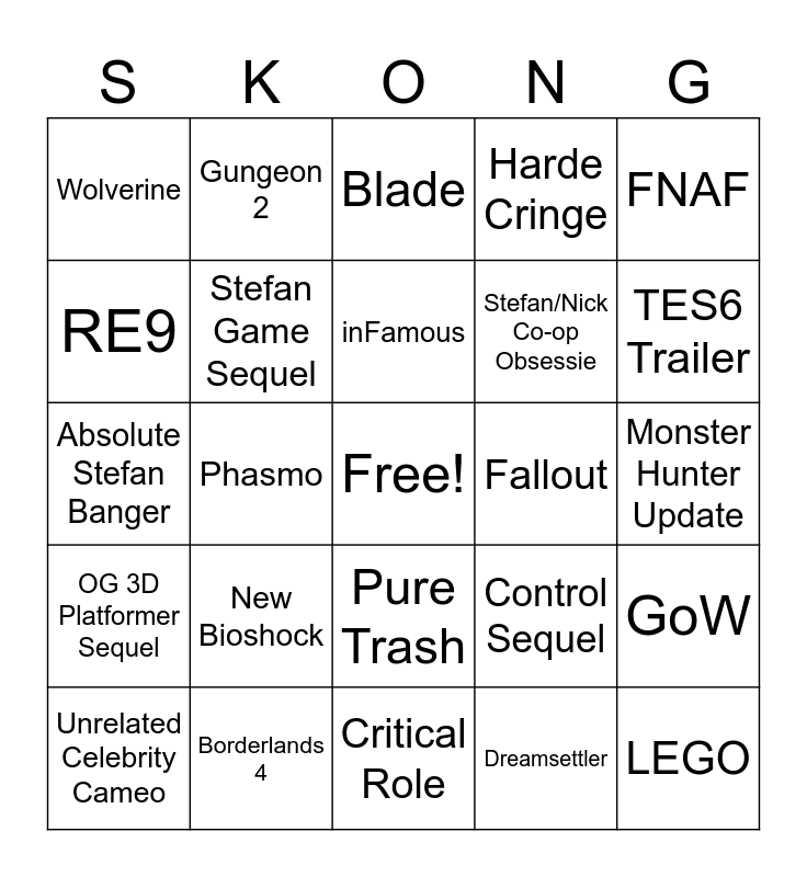 This bingo card has a free space and 24 words: New Bioshock, Borderlands 4, inFamous, Unrelated Celebrity Cameo, FNAF, Wolverine, RE9, Gungeon 2, Fallout, Pure Trash, Stefan/Nick Co-op Obsessie, Absolute Stefan Banger, Control Sequel, GoW, Stefan Game Sequel, Dreamsettler, Monster Hunter Update, Blade, TES6 Trailer, Phasmo, LEGO, OG 3D Platformer Sequel, Harde Cringe and Critical Role.