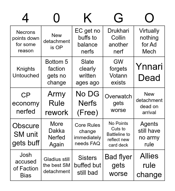 This bingo card has a free space and 24 words: More Dakka Nerfed Again, Gladius still the best SM detachment, Slate clearly written ages ago, Josh accused of Faction Bias, Virtually nothing for Ad Mech, Necrons points down for some reason, Knights Untouched, New detachment is OP, Overwatch gets worse, Core Rules change immediately needs FAQ, GW forgets Votann exists, CP economy nerfed, No Points Cuts to Battleline to reflect new card deck, Agents still have no army rule, Bottom 5 faction gets no change, Bad flyer gets worse, New detachment dead on arrival, EC get no buffs to balance nerfs, Ynnari Dead, Army Rule rework, Allies rule change, Obscure SM unit gets buff, Drukhari Collin another nerf and Sisters buffed but still bad.