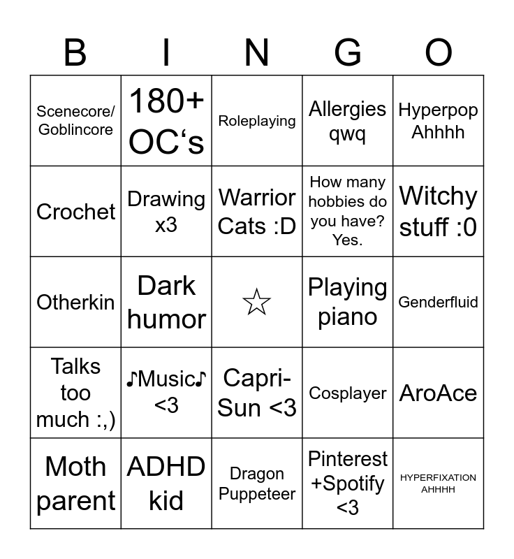 This bingo card has a free space and 24 words: ♪Music♪ <3, ADHD kid, Warrior Cats :D, Moth parent, Hyperpop Ahhhh, Scenecore/ Goblincore, Crochet, 180+ OC‘s, Playing piano, Capri-Sun <3, How many hobbies do you have? Yes., Otherkin, Cosplayer, AroAce, Drawing x3, Pinterest +Spotify <3, Genderfluid, Roleplaying, Witchy stuff :0, Dark humor, HYPERFIXATION AHHHH, Talks too much :,), Allergies qwq and Dragon Puppeteer.