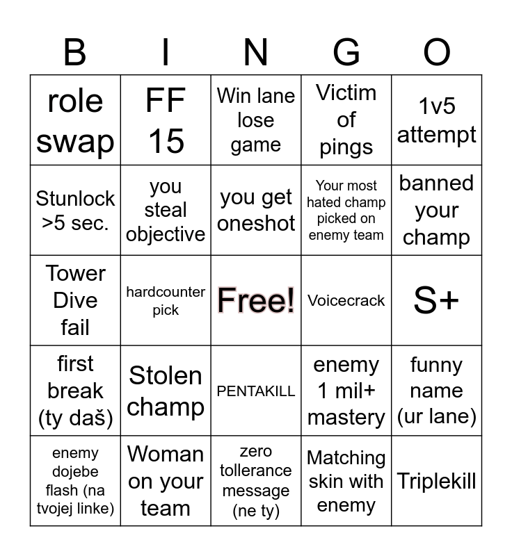 This bingo card has a free space and 24 words: Stolen champ, Woman on your team, you get oneshot, enemy dojebe flash (na tvojej linke), 1v5 attempt, role swap, Stunlock >5 sec., FF 15, Voicecrack, PENTAKILL, Your most hated champ picked on enemy team, Tower Dive fail, enemy 1 mil+ mastery, funny name (ur lane), you steal objective, Matching skin with enemy, S+, Win lane lose game, banned your champ, hardcounter pick, Triplekill, first break (ty daš), Victim of pings and zero tollerance message (ne ty).
