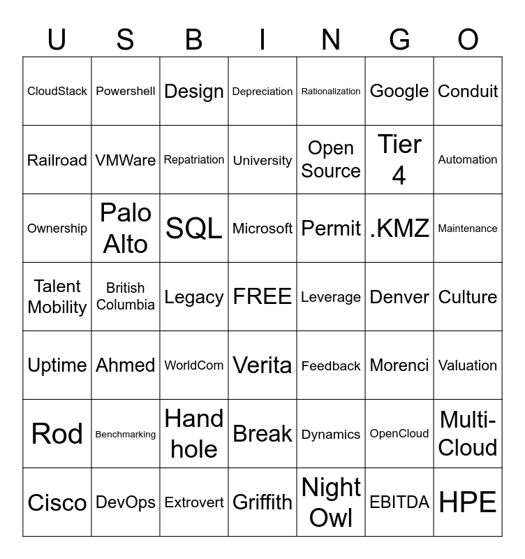 This bingo card has a free space and 48 words: Dynamics, Tier 4, Griffith, British Columbia, SQL, Culture, Powershell, DevOps, Google, Verita, Conduit, Depreciation, .KMZ, Permit, Rod, Denver, Railroad, Automation, OpenCloud, Rationalization, Open Source, Legacy, CloudStack, VMWare, Multi-Cloud, Repatriation, Maintenance, Cisco, Microsoft, Palo Alto, EBITDA, Leverage, Valuation, Benchmarking, Talent Mobility, Feedback, Morenci, Ownership, WorldCom, Hand hole, Uptime, HPE, Design, Extrovert, University, Break, Ahmed and Night Owl.